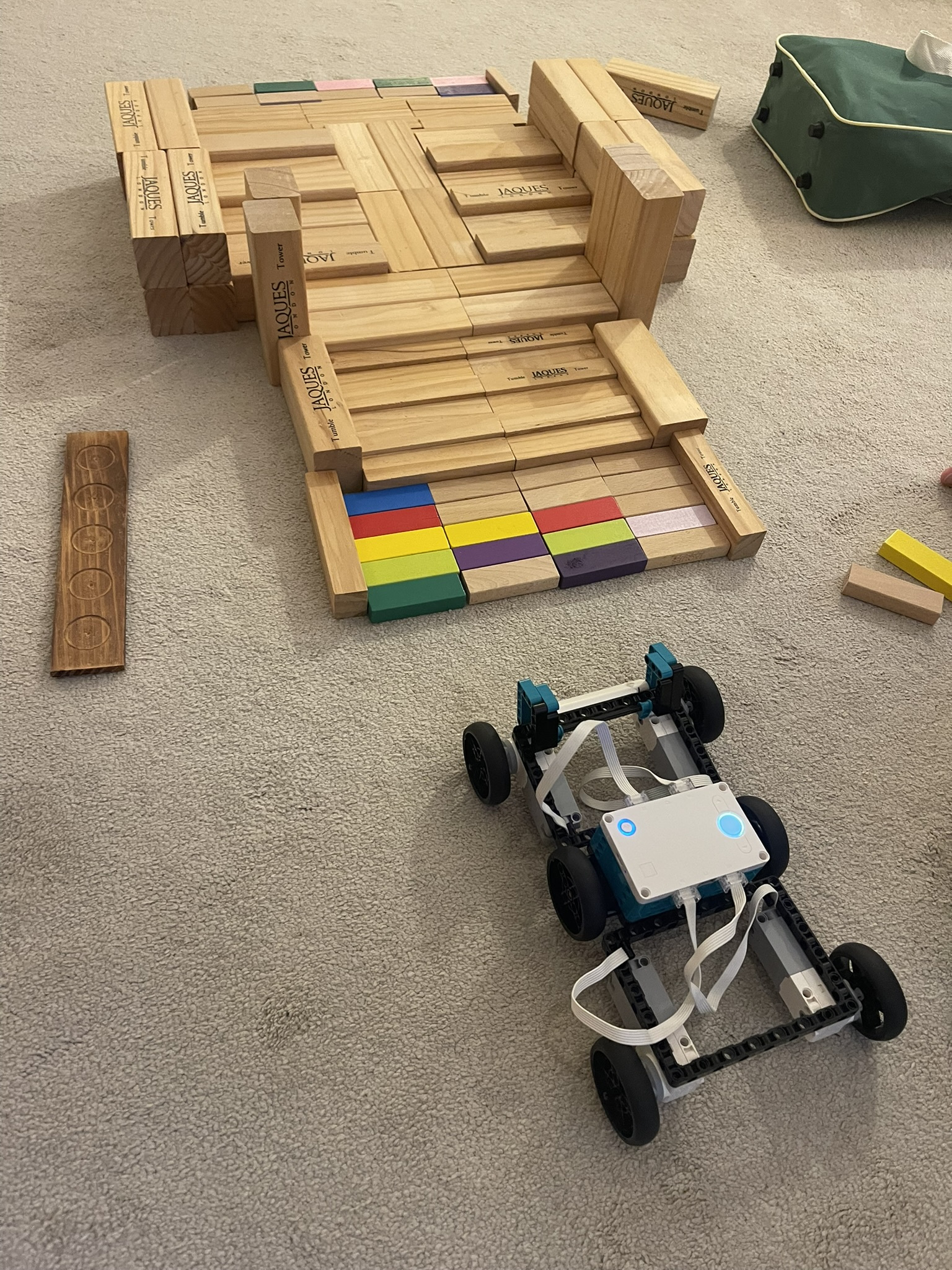 After that, I opened my Mindstorms app and started programming a simple controller. The controller could move it back and forth, left and right. Finally, I gathered some of my bricks and laid them out in a rough terrain way. At first, it couldn’t even get up the lowest level because the vehicle wasn't strong enough, so I put the wheel speed up, and it managed to get over it fine. Then, when it passed that section, the whole thing broke! And the frames separated.