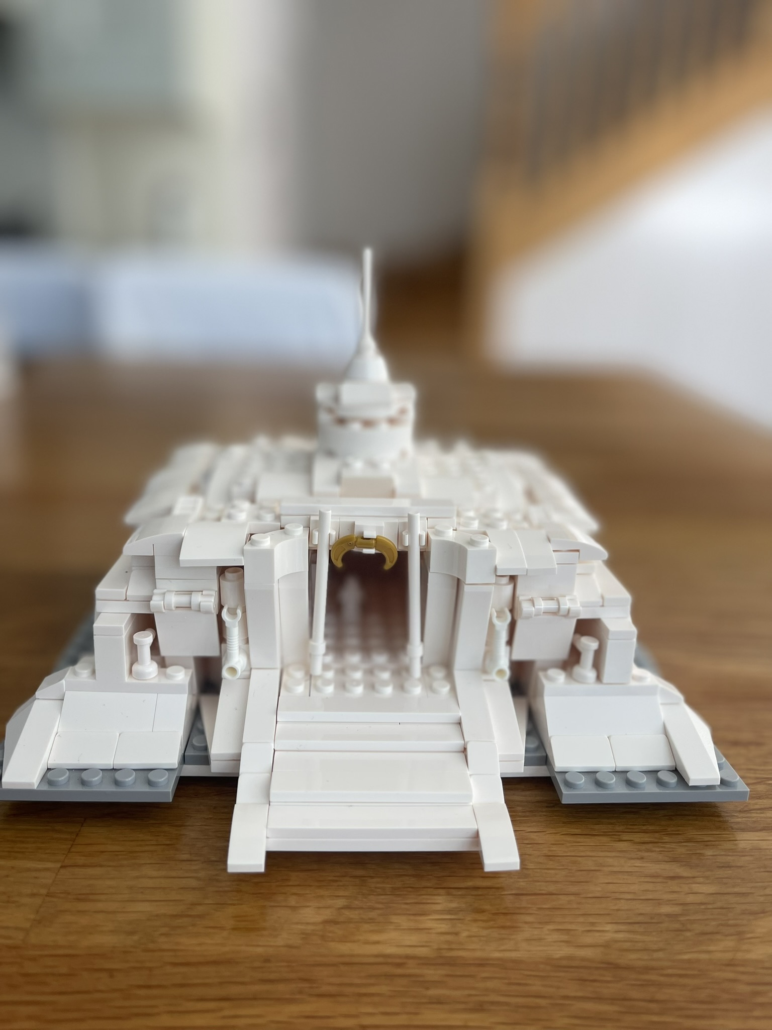 The next week of homework was to create a model or picture of your own Indian temple. I got very excited as I knew this man I could use Lego so I went up to my room and broke one of my completely white spaceships. It took me about an hour to complete and then I just brought it into school and everyone loved it.